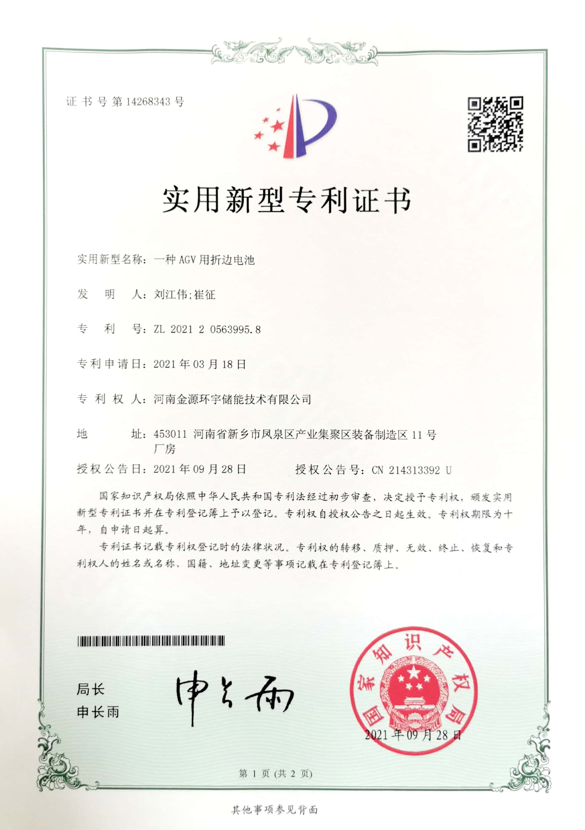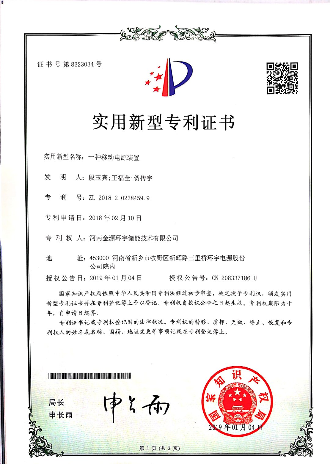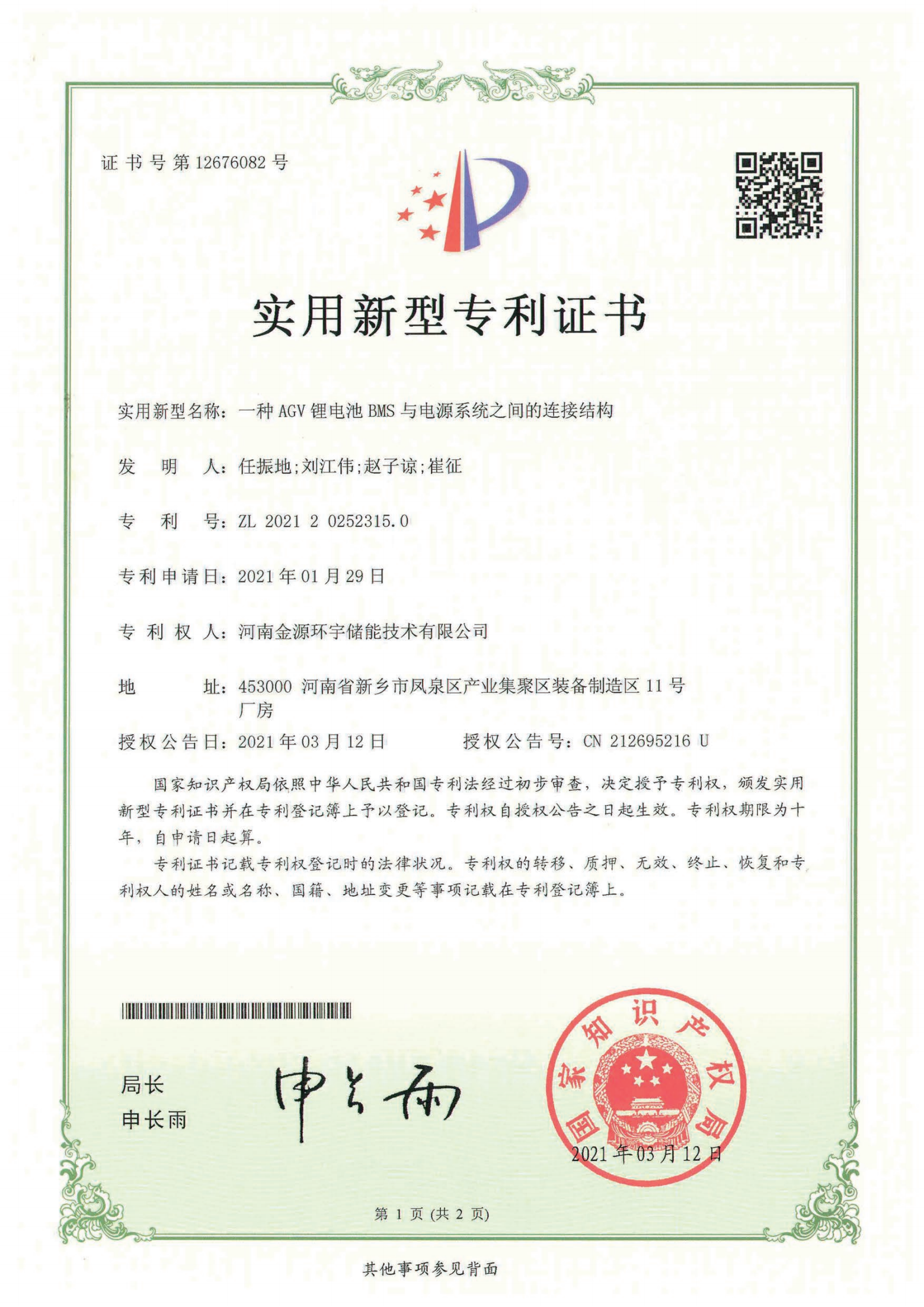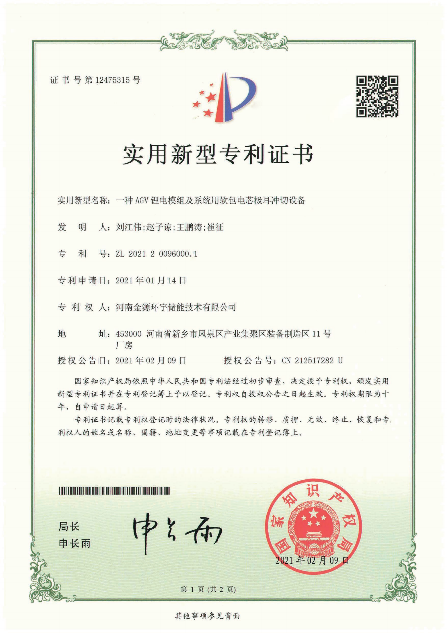 Patent Certificates Obtained by Jinyuan Huanyu Energy Storage Technology Co., Ltd.