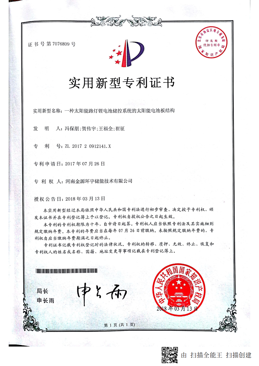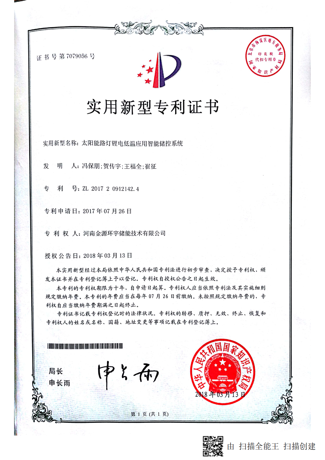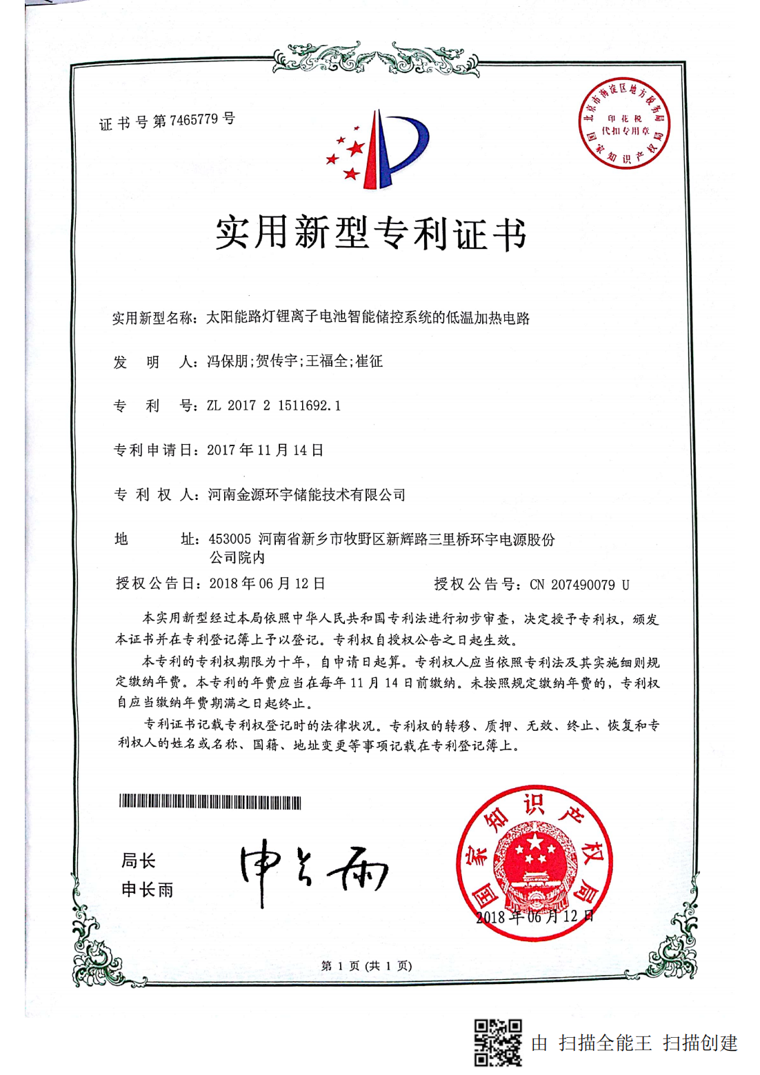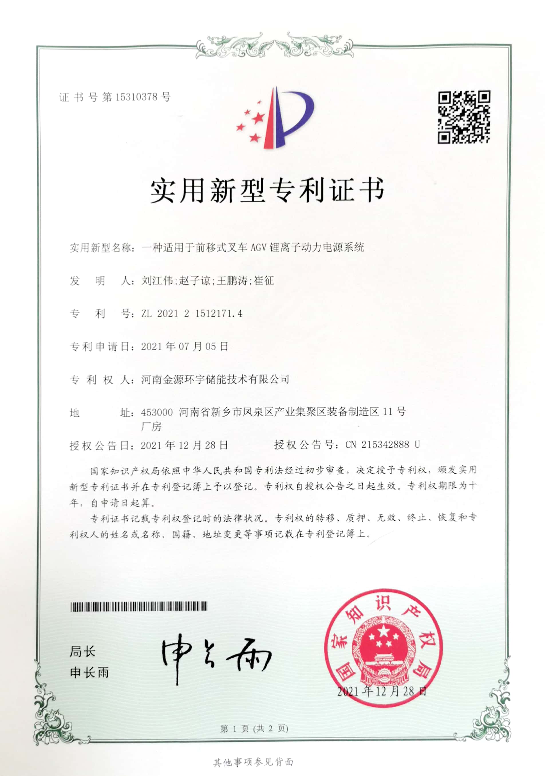 Patent Certificates Obtained by Jinyuan Huanyu Energy Storage Technology Co., Ltd.