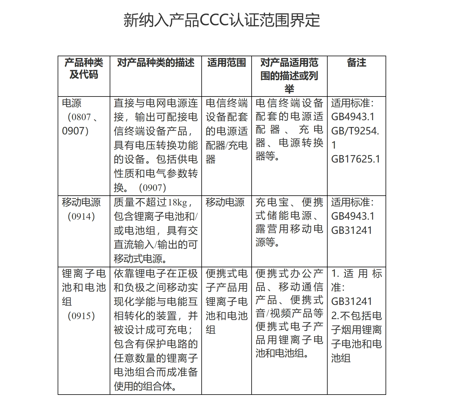 二、对新纳入产品的CCC认证范围界定详见附件。其中,对于电子电器产品使用的锂离子电池和电池组,现阶段先行对便携式电子产品用锂离子电池和电池组开展CCC认证;对于其他电子电器产品使用的锂离子电池和电池组,待条件成熟后,适时开展CCC认证。