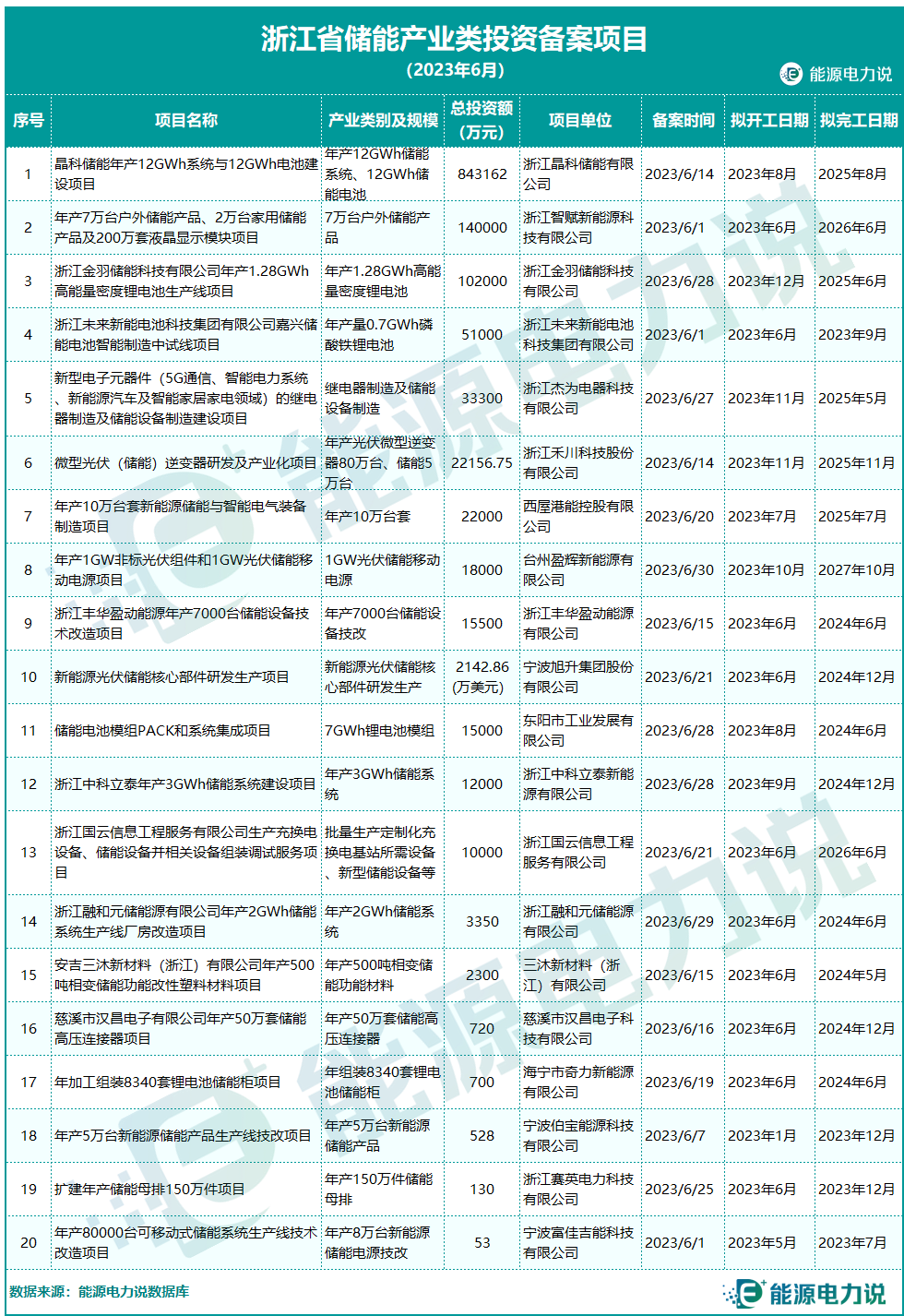 6月浙江备案产业类储能项目20个,总投资金额超130亿元,涉及储能产业领域包括储能系统、锂电池、移动电源、锂电池模组、储能柜、高压连接器、母排、相变储能材料等生产线建设及技改项目。其中包括投资84亿元的晶科储能年产12GWh系统与12GWh电池建设项目、浙江金羽储能投资10亿元的年产1.28GWh高能量密度锂电池项目,浙江未来新能5.1亿元年产量0.7GWh磷酸铁锂电池中试线等大额投资项目。