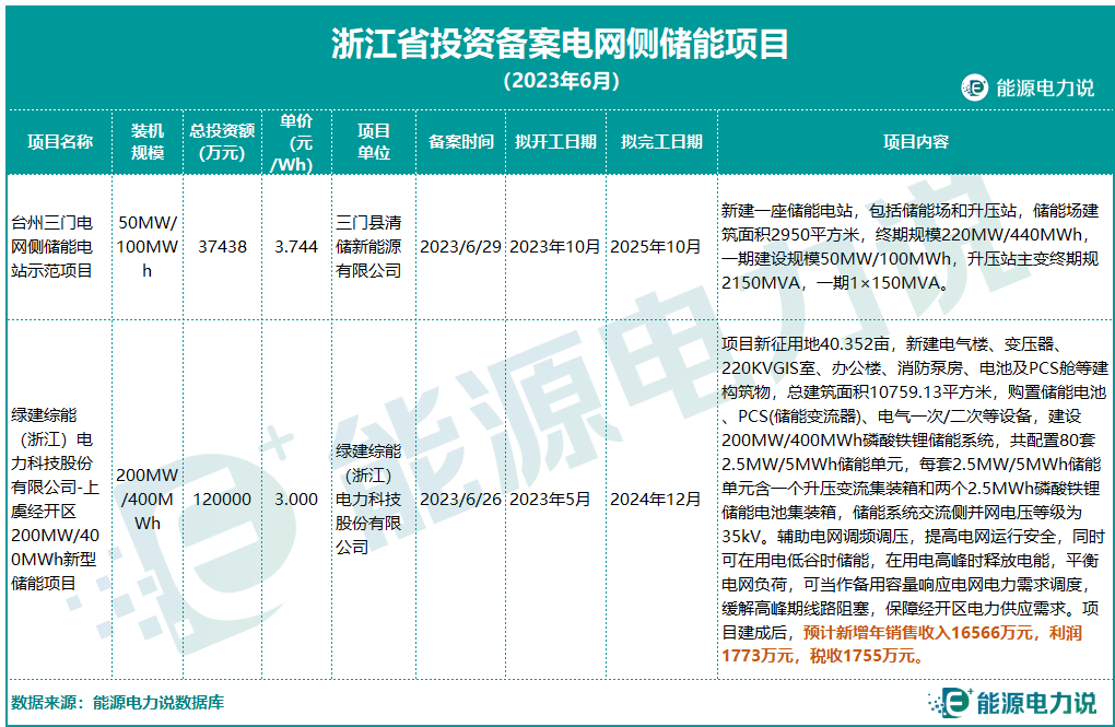 两个电网侧储能项目初始投资单价均在3元/Wh以上,其中上虞经开区200MW/400MWh新型储能项目,项目投资12亿元,预计新增年销售收入1.66亿元。