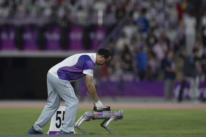 On the field, adorable robotic dogs (quadruped robots) performed dances and transported discus.。