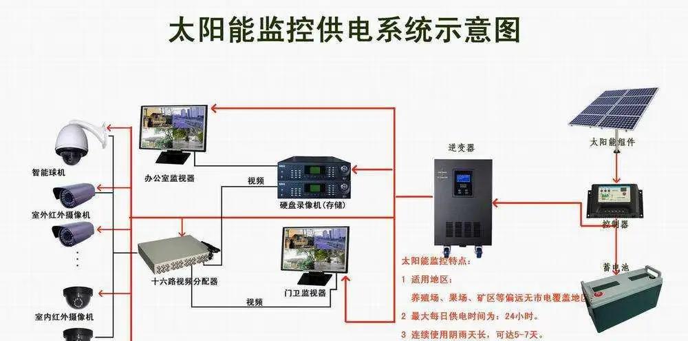 3). 当到夜间、阴天等日照条件不好的情况下,转由储能系统给视频监控供电。