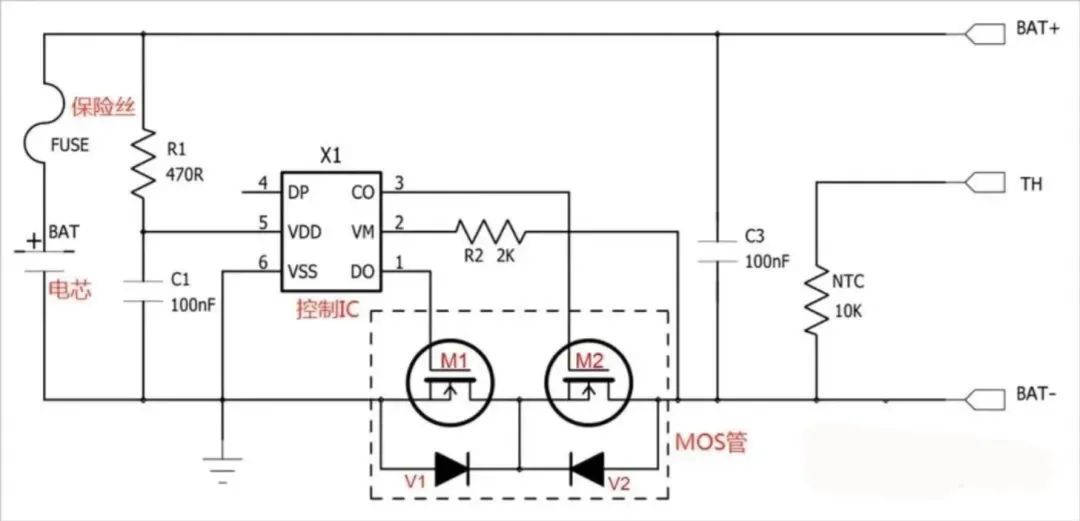 In the diagram above, the control IC controls the MOS switches to turn the circuit on and off, thus protecting the circuit. The FUSE provides secondary protection based on this. TH is for temperature detection, internally containing a 10K NTC. The NTC primarily performs temperature detection. The TVS mainly suppresses surges.