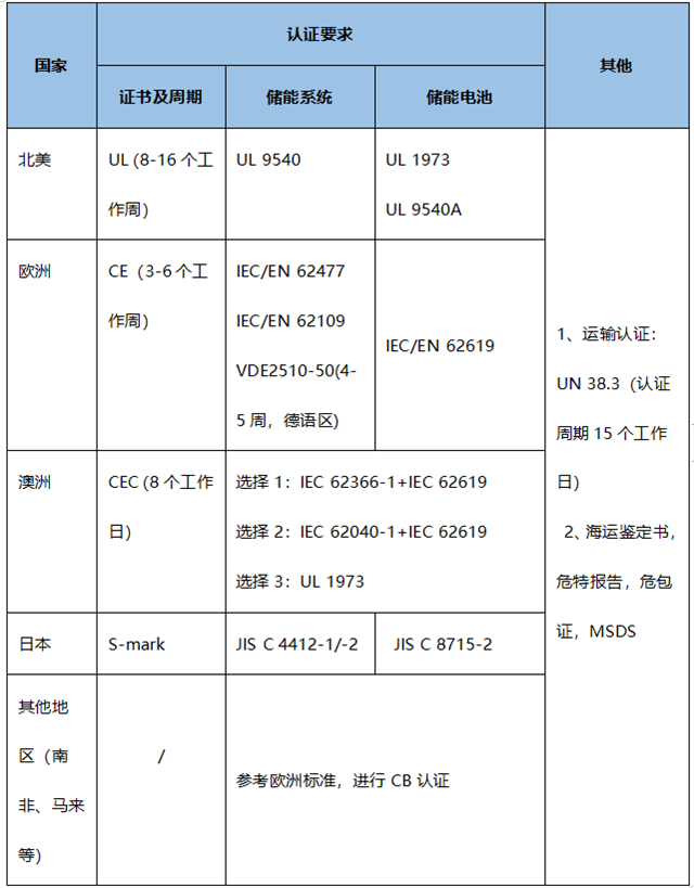 Generally speaking, there are four main types of certification systems: 1. North America: UL certification system; 2. Europe: CE certification system; 3. Australia: CEC certification system; 4. Japan: JIS certification system. In addition, there are transportation-related certifications such as UN38.3, as well as dangerous goods packaging certificates, dangerous goods reports, and maritime inspection certificates.